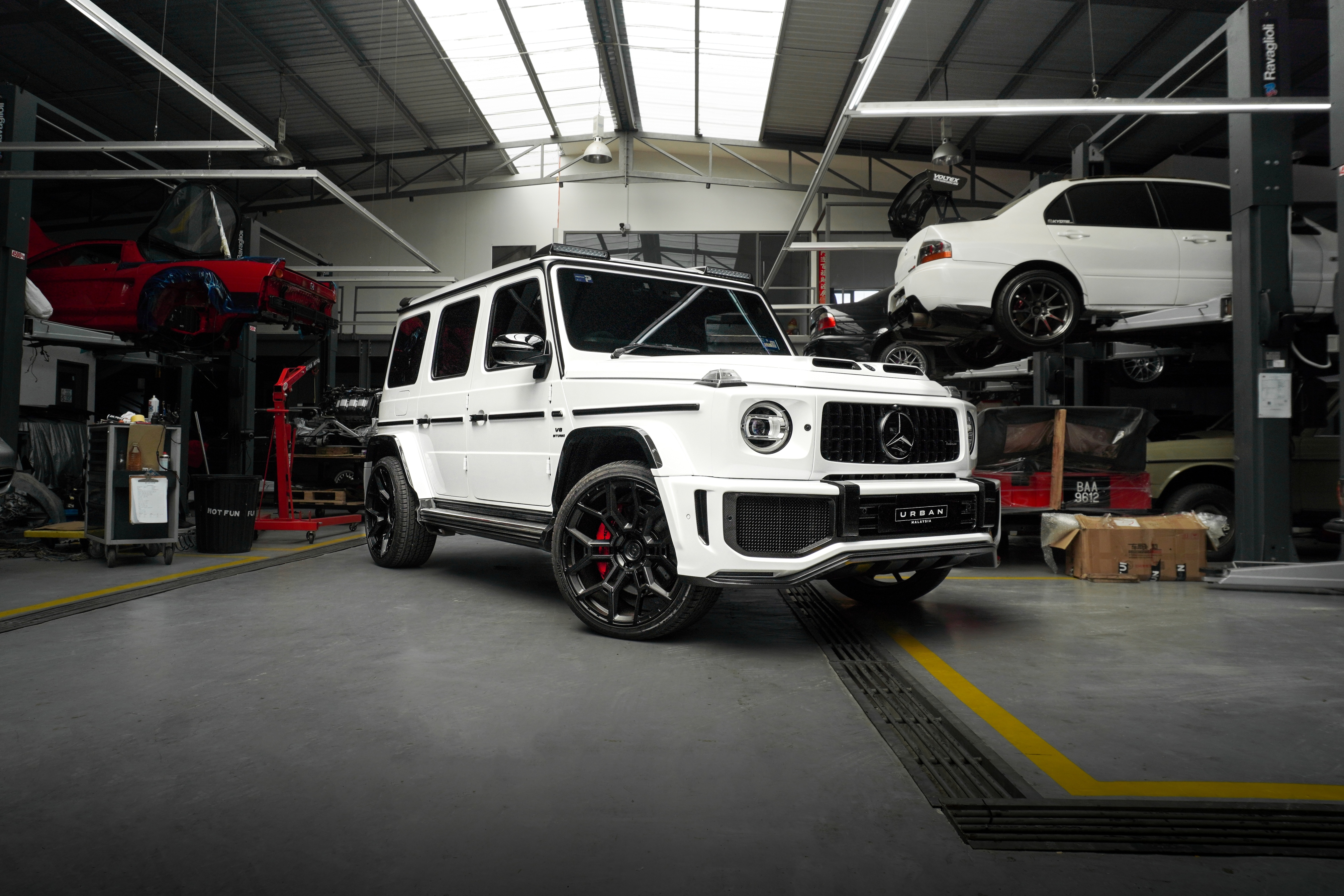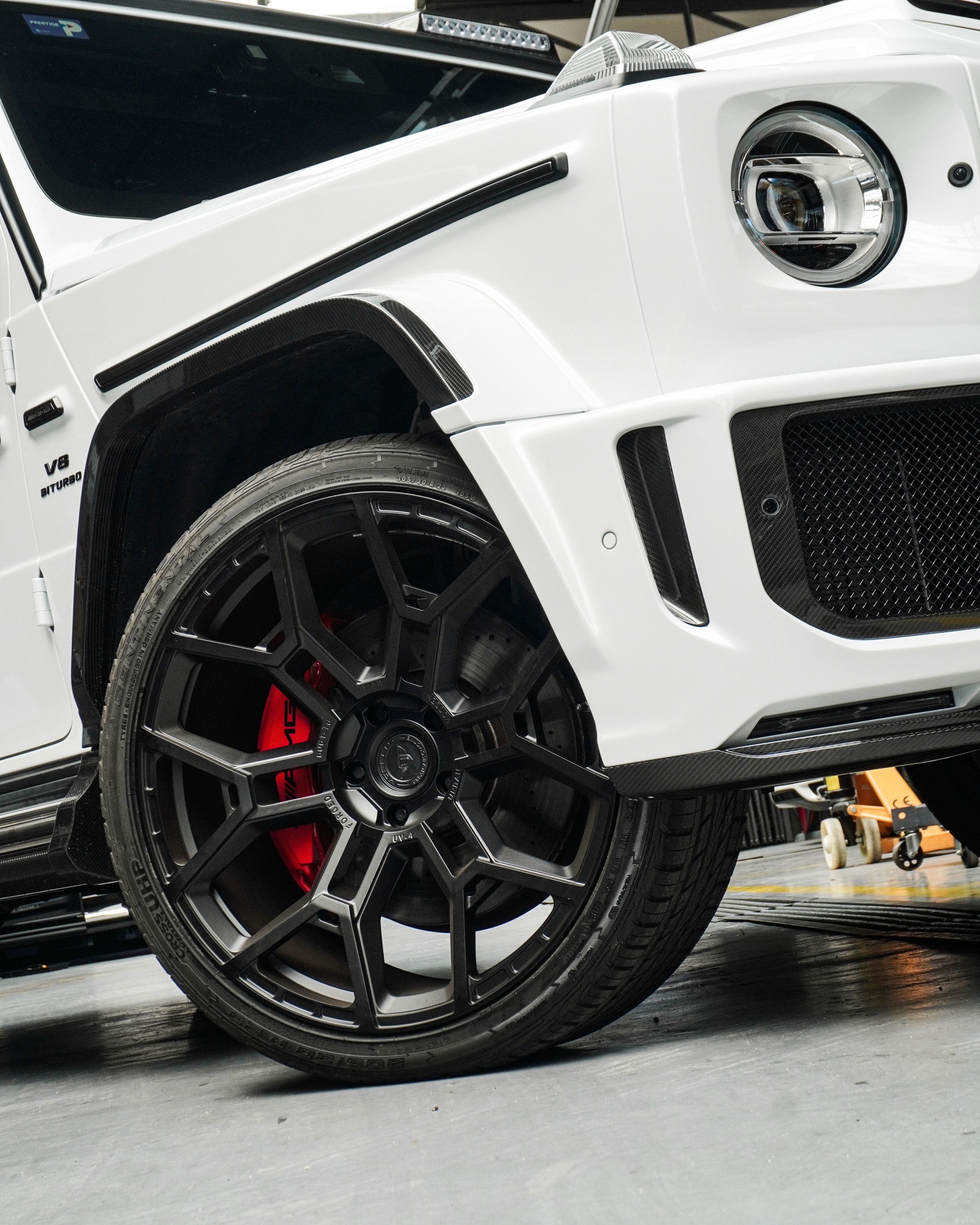 This Mercedes-AMG G63 Widetrack is enhanced with the Urban Automotive carbon fiber wide body kit, elevating the iconic G-Class with bespoke luxury and commanding road presence. The exterior features a carbon fiber front bumper with integrated intake and side vent sets, carbon front splitter, extended widetrack arches, and sculpted lower side sills with end caps, creating a wider and more aggressive stance. At the rear, a carbon fiber bumper, rear intake and side vent sets, and a visual carbon fiber diffuser add depth and refinement, while the rear wheel carrier completes the signature G-Class silhouette. Upper enhancements include a vented bullnose bonnet, Nolden integral DRL, roof light cluster, and an upper rear spoiler, delivering both functional aerodynamics and distinctive Urban styling. Riding on 23-inch Urban Automotive UV-4 forged alloy wheels and paired with a Veleno Performance stainless steel catback exhaust system, this luxury G63 build offers an authoritative exhaust tone and premium craftsmanship—ideal for enthusiasts seeking a high-end Urban Automotive Mercedes-AMG G63 Widetrack conversion in Malaysia.